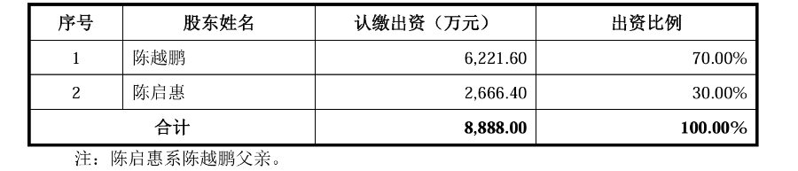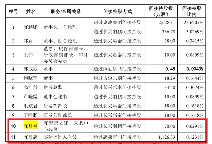 值得关注的是的,陈越鹏的妹妹陈月琴在惠康科技任采购中心总监,通过长兴羽鹏间接持有惠康科技0.6291%的股权。
