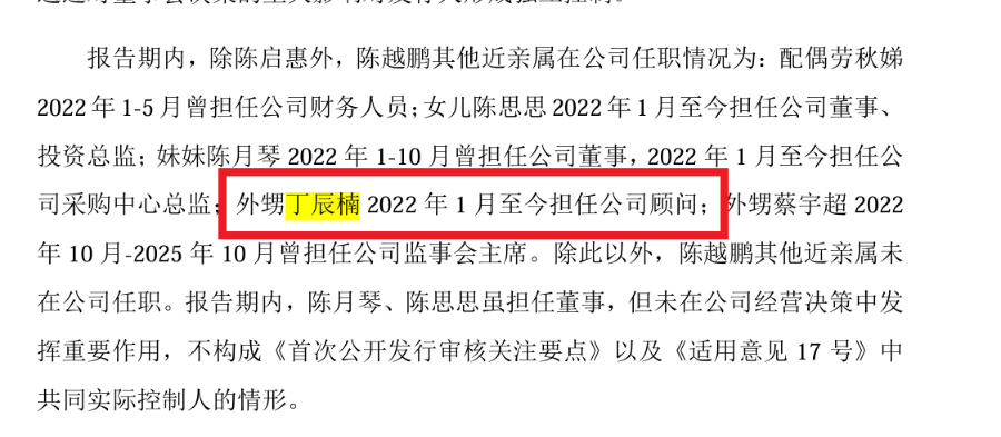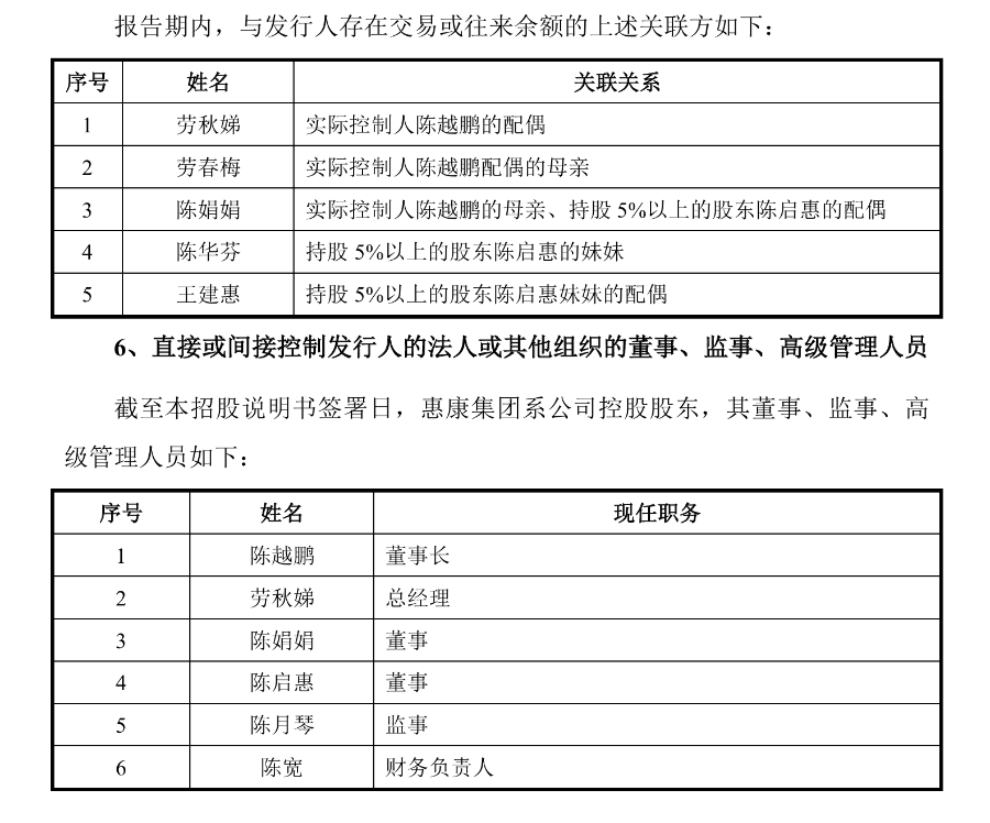 此外,陈越鹏及多位亲属在惠康集团任职。招股书显示,陈越鹏任惠康集团董事长,陈越鹏的配偶劳秋娣任惠康集团总经理,陈越鹏的母亲陈娟娟任惠康集团董事,陈越鹏的父亲陈启惠任惠康集团董事,陈越鹏的妹妹陈月琴任惠康集团监事。