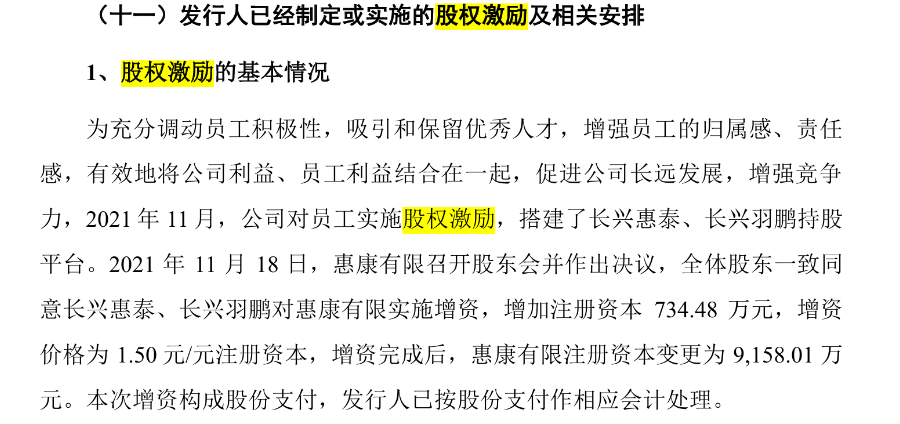 招股书显示,2021 年 11 月 18日,惠康有限召开股东会并作出决议,全体股东一致同意长兴惠泰、长兴羽鹏对惠康有限实施增资,增加注册资本734.48 万元,增资价格为1.50元/元注册资本。