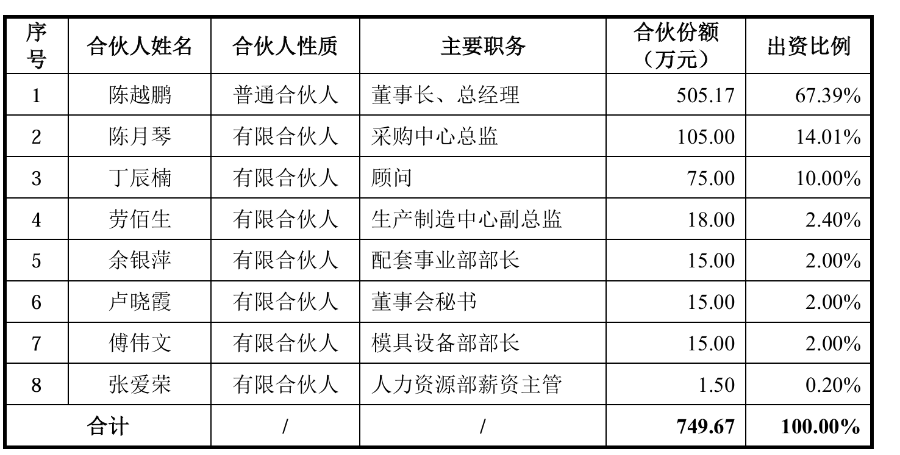 长兴羽鹏的合伙人构成显示,陈越鹏出资比例67.39%、陈月琴出资比例14.01%、丁辰楠出资比例10%,其余5个股东合计出资比例8.60%。
