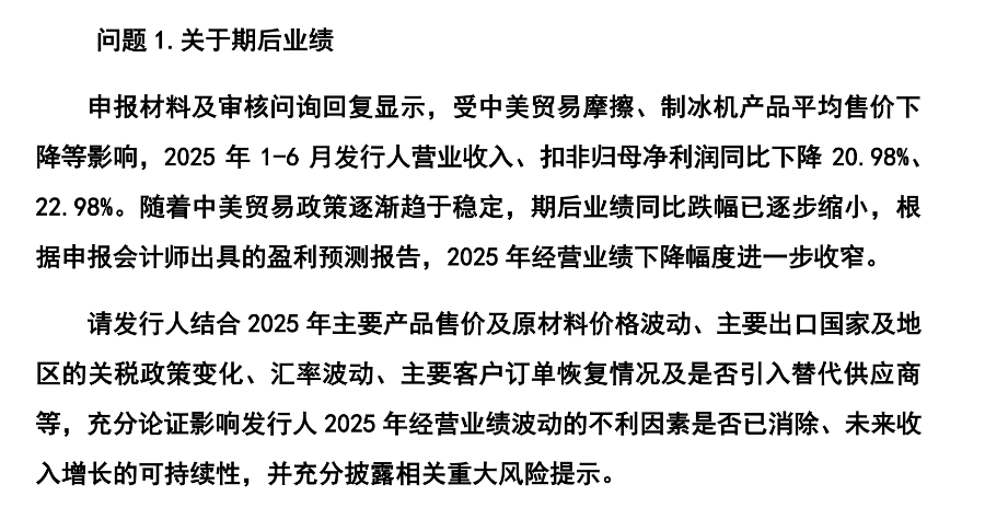 但在后续的审核中交易所对惠康科技的业绩情况仍保持高度关注,审核中心意见落实函中盈利网,交易所要求惠康科技人结合 2025 年主要产品售价及原材料价格波动、主要出口国家及地区的关税政策变化、汇率波动、主要客户订单恢复情况及是否引入替代供应商等,充分论证影响发行人 2025 年经营业绩波动的不利因素是否已消除、未来收入增长的可持续性,并充分披露相关重大风险提示。