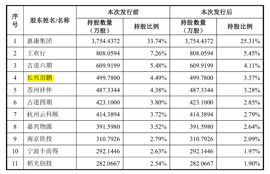 招股书显示,2021年11月,惠康科技对员工实施股权激励,搭建了长兴惠泰、长兴羽鹏持股平台。截至招股说明书签署日,长兴羽鹏持有惠康科技4.49%股权。