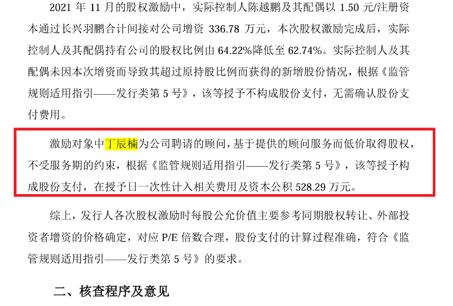 首轮问询回复显示,2021 年 11 月的股权激励中,激励对象中丁辰楠为公司聘请的顾问,基于提供的顾问服务而低价取得股权,不受服务期的约束,根据《监管规则适用指引——发行类第5号》,该等授予构成股份支付,在授予日一次性计入相关费用及资本公积528.29万元。