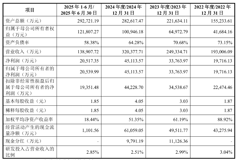 招股书显示,2022年-2024年及2025年1-6月(以下简称“报告期”),惠康科技营业收入分别为 193,006.09 万元、249,334.71 万元、320,377.71 万元、138,907.72 万元,归属于母公司所有者的净利润分别为19,716.13万元、33,763.97万元、45,113.57万元、20,539.99万元。