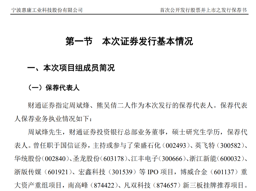 此次惠康科技IPO的保荐机构为财通证券,保荐人为周斌烽,熊吴倩。惠康科技发布的发行保荐书显示,周斌烽为财通证券投资银行总部业务董事,硕士研究生学历,保荐代表人。曾任职于国信证券,主持或参与了荣盛石化(维权)(002493)、英飞特(300582)、华统股份(002840)、圣龙股份(603178)、江丰电子(300666)、浙江新能(600032)、浙版传媒(维权)(601921)、宏鑫科技(301539)等 IPO 项目,博威合金(601137)重大资产重组项目,南高峰(874422)、凡双科技(874657)新三板挂牌推荐项目。